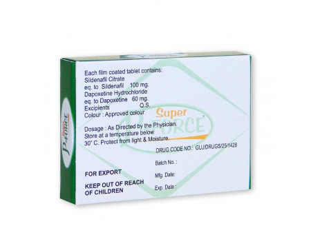 A fórmula do medicamento é única no sentido em que contém duas substâncias activas diferentes em vez de uma, que actuam em paralelo. Devido à nova combinação de Sildenafila/Dapoxetina (100 mg/60 mg), a Super P Force é referida a uma classe separada de medicamentos.